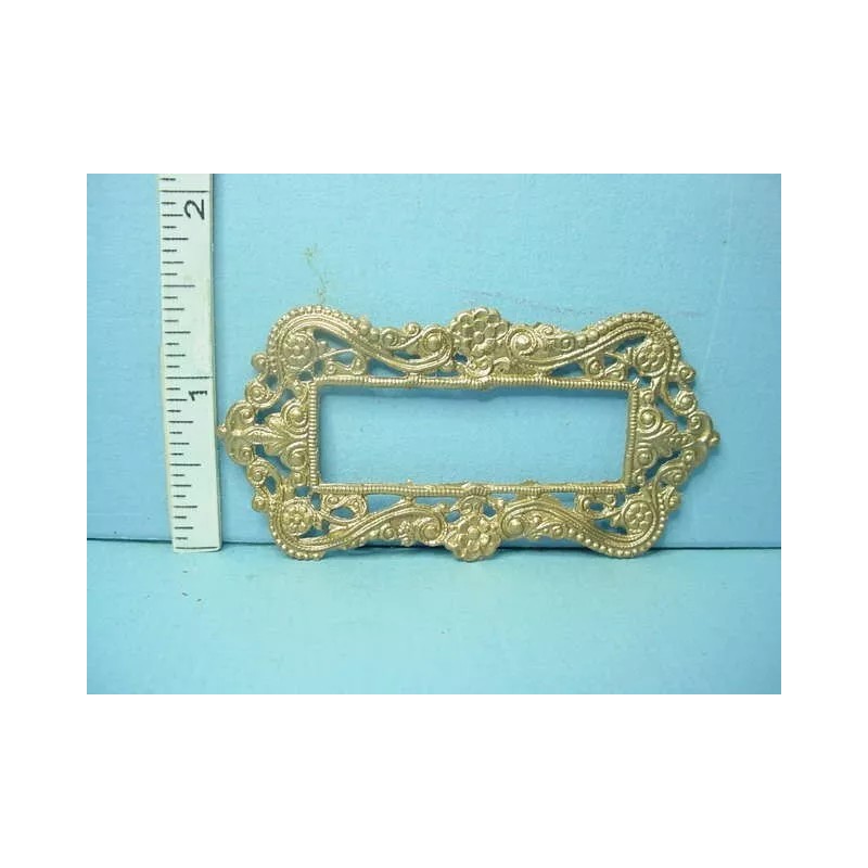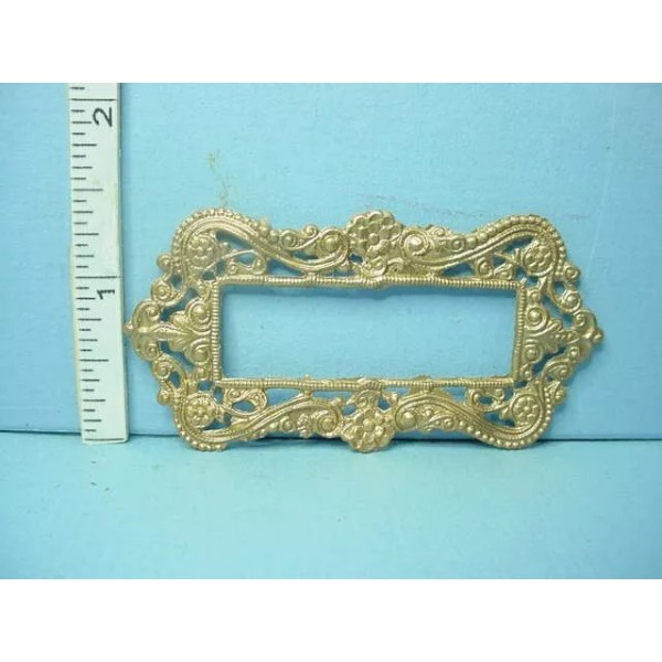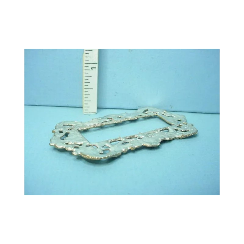 This is a 1" (1:12) scale picture frame from Reynolds Miniatures. Measures outside approx 1-1/2"T x 2-7/8"L, inside approx 1-3/4"L x 9/16"T, painted metal, flat back, no inset, gold-tone.