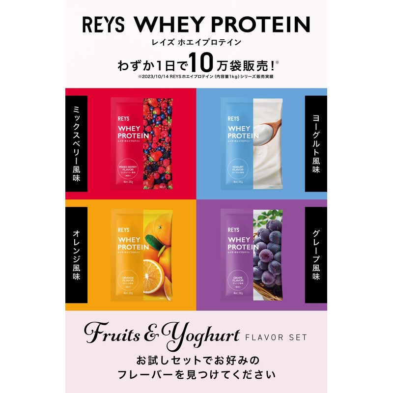 REYS レイズ ホエイ プロテイン お試し セット 個包装 30g × 4種 山澤 礼明 監修 国内製造 ビタミン7種配合 WPCプロテイン ぷろていん ホエイプロテイン ミックスベリー ヨーグルト オレンジ グレープ (4個セット, フルーツ&ヨーグルトフレーバー)