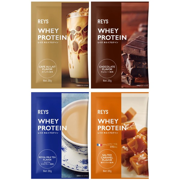 REYS レイズ ホエイ プロテイン お試し セット 個包装 30g × 4種 山澤 礼明 監修 国内製造 ビタミン7種配合 WPCプロテイン ぷろていん ホエイプロテイン カフェオレ チョコレート ロイヤルミルクティー 塩キャラメル (4個セット, スイーツ&カフェフレーバー)