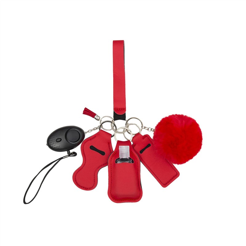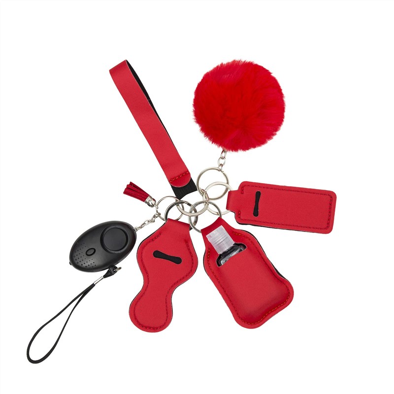 REZIME Keyring Keychain Set for Women Girls with Personal Alarm, Lipstick Holder, Travel Bottle, Bottle Holder, Pom Pom, Tassel and Wristlet, Alarm with Flashlight (Red)