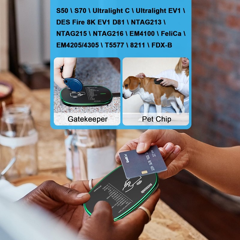 - Support Cards: S50, S70, Ultralight C, Ultralight EV1, DES Fire 8K EV1 D81, NTAG213, NTAG215, NTAG216, EM4100, EM4205/4305, T5577, 8211, ID, FDX-B, FeliCa etc.