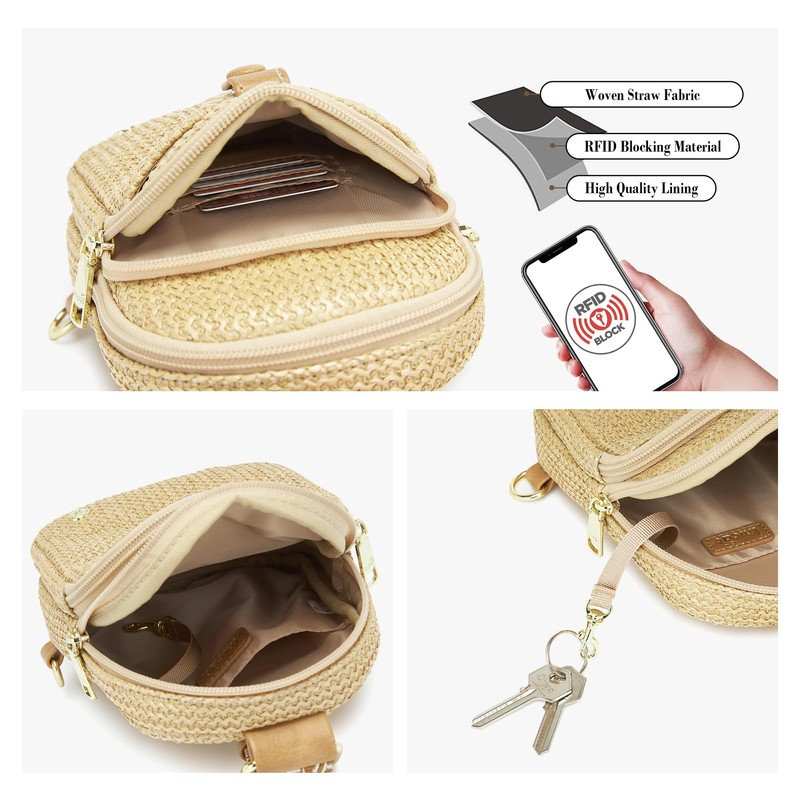 - Compact Design: The rfid straw crossbody bags with 1 main zipper pocket that contains 1 inner pouch and 1 keychain. Middle with 1 front zipper pocket that includes 4 RFID blocking credit card slots. External with 1 front button pocket or 1 front zipper pocket. Zipper closures and RFID blocking technology ensure the safety of personal items