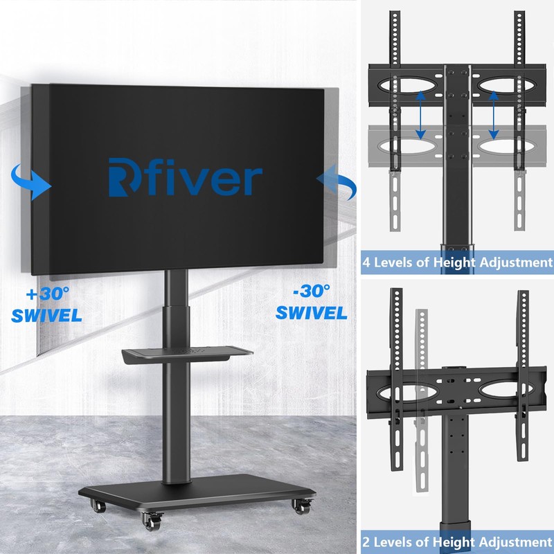 Rfiver Mobile TV Cart Rolling TV Stand for 32-70 Inch Flat/Curved TVs, Tall Floor TV Stand with Swivel Mount Hold up to 88 lbs, Portable TV Stands on Wheels with Height Adjustable for Home and Office