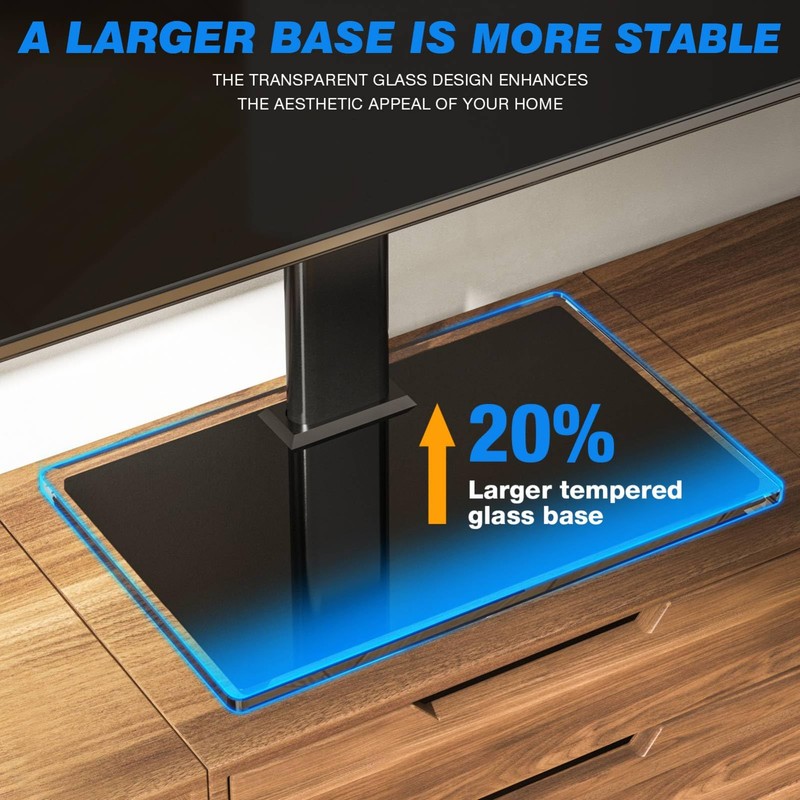- 【SAFE AND STABLE】--Designed with a heavy duty steel pole and tempered glass base, this table top TV stand can easily hold your TV on your table with safety and stability,mount weight capacity up to 88 lbs. Furthermore, this tv stand enabled you to use your existing entertainment center and installing a larger TV, it would also look good in any room.