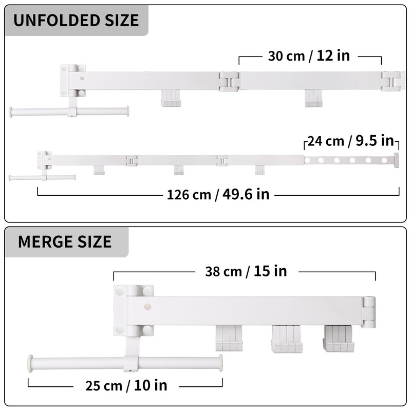 - More functionality: This drying rack clothing wall mount is different from other foldable wall mounted drying racks for laundry in that the upgraded hooks have a Bidirectional J-shape and loop combination, the upgraded telescopic pole has 6 windproof clips, and add a storage hanger pole