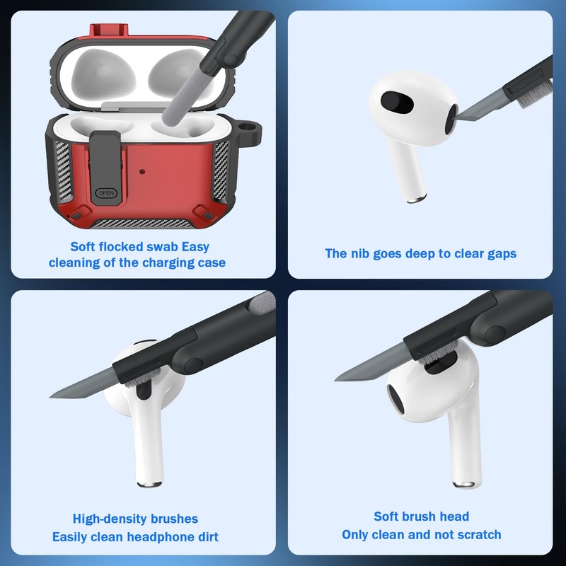 - Multi-functional Cleaning Pen: The for Airpod cleaning Kit has Silicone nib to remove dirt from hidden cracks and holes. The soft flocked sponge absorbs fine dust inside the wireless earbuds charging case. The high-density brush can easily clean the dirt on the sound hole of the earphone.
