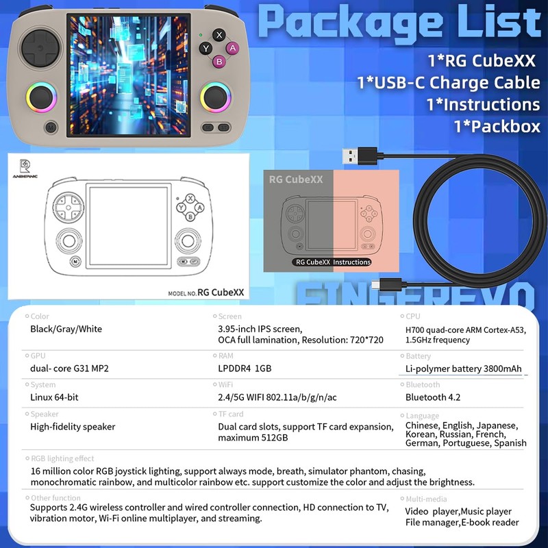 • Packlist: 1*RG CubeXX Gray, 1*USB-C Charge Cable, 1*Instruction.