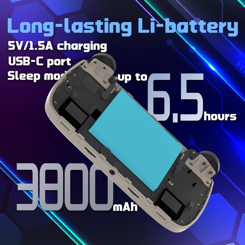 • Built-in 3800mAh 3.8V LiPo battery 4-6 hours life 5V/1.5A 7.5W charging