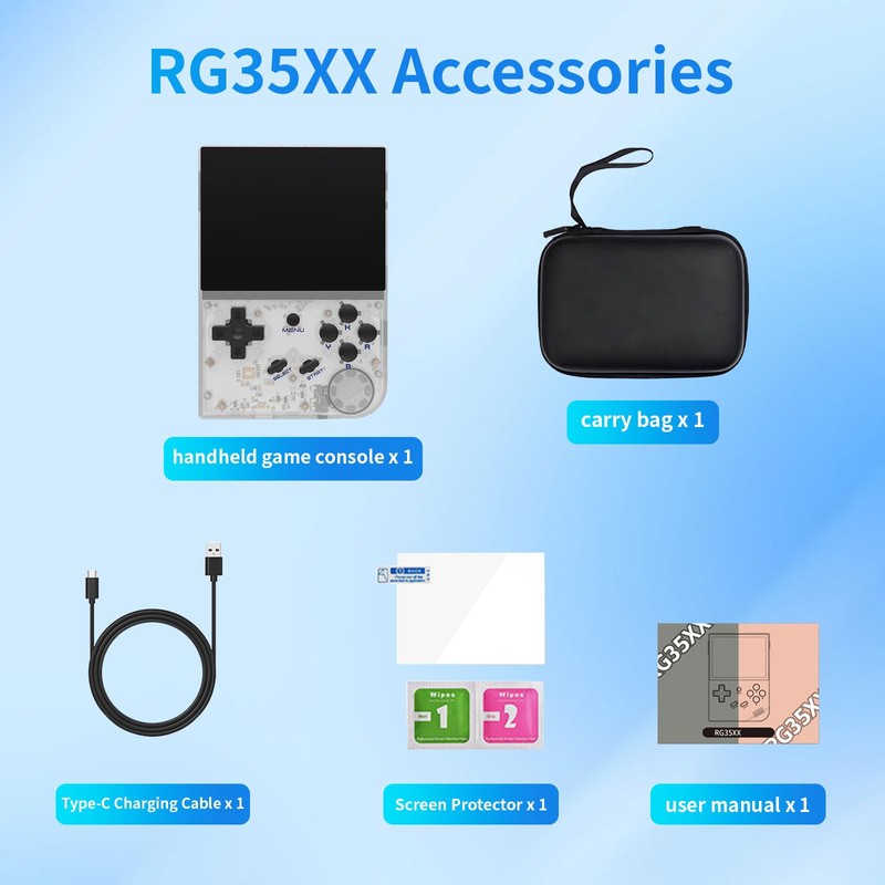 • 【What You'll Get】1x RG35XX Handheld Game Console, 1x 64GB TF Card,1x 128G TF Card, 1x USB-C Charging Cable, 1x Screen Protector,1 x Carry bag,1x User Manual.