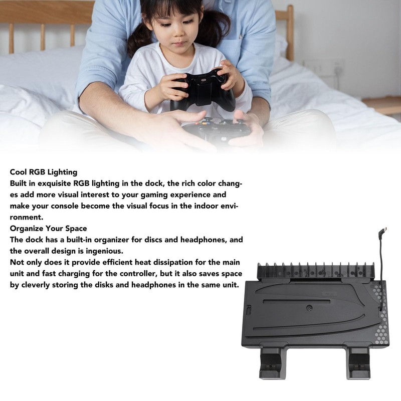 - SPACE ORGANIZATION: The base has a built in disc and headphone organizer, and the overall design is ingenious, which not only provides efficient heat dissipation for the host and fast charging for the controller, but also cleverly stores the disc and headphone in the same device, which greatly saves space.