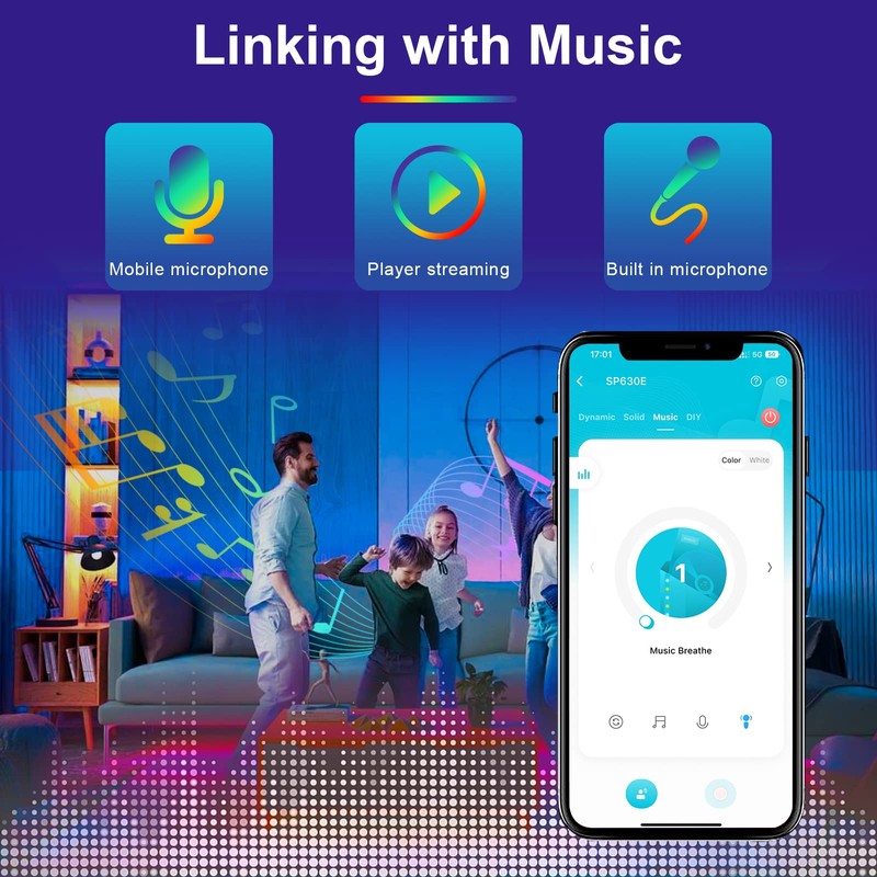 2.Music sync mode: With the built-in sensitive microphone, the LED light will sync the music in music mode. When used with the App, the LED light can also be synchronised with music from your phone or via your phone's microphone.
