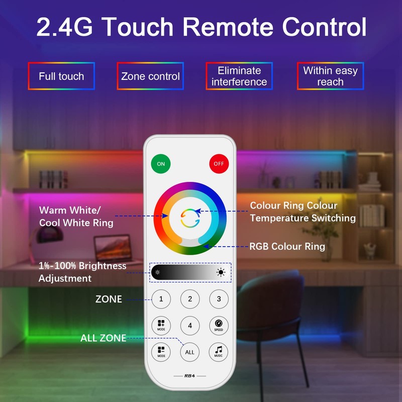 - 2.4G Wireless Remote Control 30M(98FT) : LED controller supports touch type 2.4G RF wireless remote controls. 2.4G wireless remote control technology, with low power consumption, long transmission distance, strong anti-interference ability etc. Touch control, high sensitivity. One RF remote control can control up to 4 groups of lights.Each group can control an LED strip within 30m (98ft).