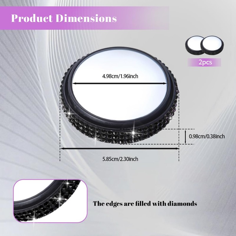 - [Unique design] : The shell of this small blind spot mirror is partially inset with shining rhinestones, which can become dazzling under the sunlight and light, adding fashionable colors to your car, bringing a different visual experience, which is very decorative and shows personality characteristics. The unique and beautiful exterior design makes the tiny car mirror not only a practical blind spot mirror, but also a beautiful car exterior decoration, bringing you different driving pleasure.