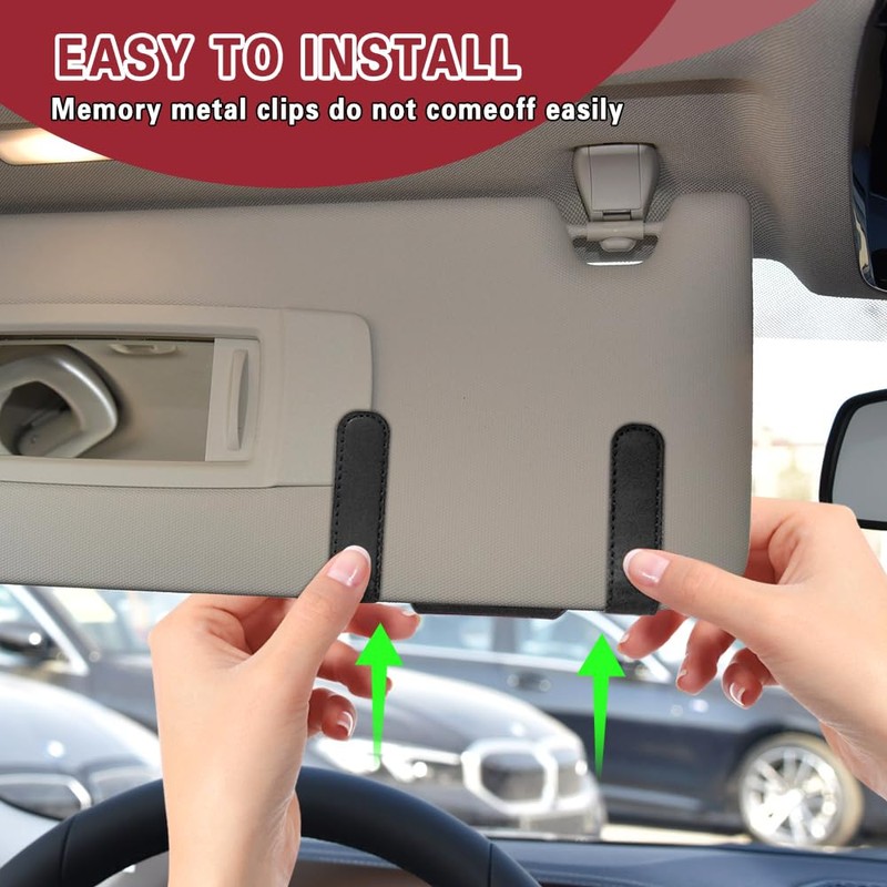 • [Easy installation]: The installation of sunglasses holder for car visor is very simple, just the two memory alloy clips on the back of the sun visor can be clamped. The two clamps are sturdy and not easily broken or deformed