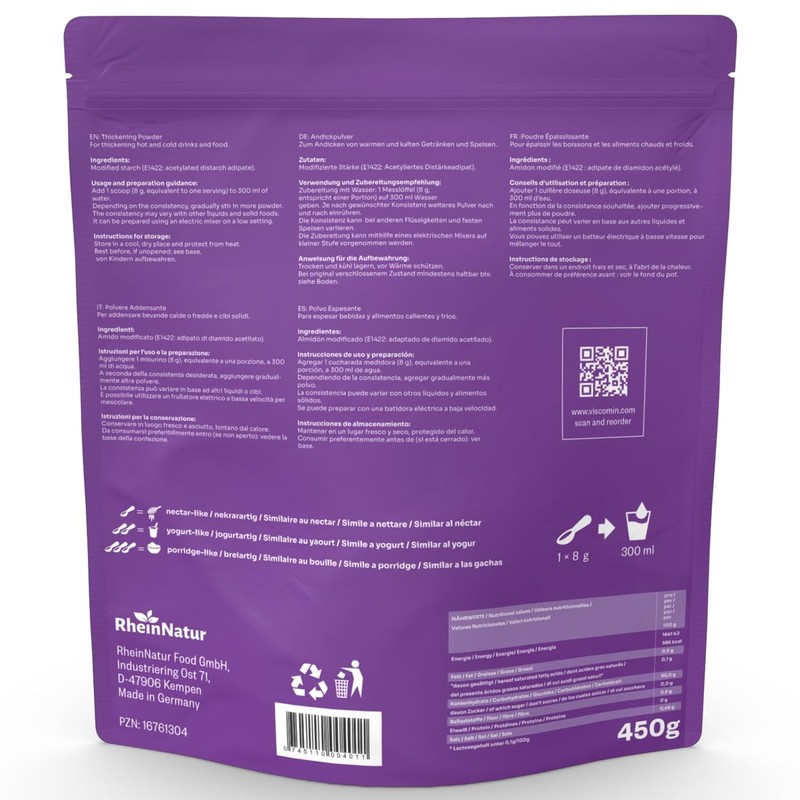 Viscomin thickening powder from RheinNatur sets new standards in the rich diet for people with difficulty swallowing. Formulated on a potato starch basis, this thickener is the key to safe and pleasant food intake. It dissolves effortlessly in cold and hot foods as well as drinks without leaving unwanted lumps. The special quality of Viscomin thickening powder is evident in its versatility. It preserves the consistency of fortified food and drinks even after microwave heating or freezing. Whether smoothies, sauces or soups - with this powder the desired texture is easily achieved. The simplicity in dosage is another plus. One to three spoons of the powder is enough to turn 300 ml of liquid into the desired consistency, from nectar-like to mush-like. This allows individual adaptation to the specific needs and preferences of the user. In addition, the thickening powder is both tasteless and colour-neutral. It does not affect the taste or colour of the food and drinks to be prepared. RheinNatur stands for first-class food from Germany and attaches great importance to the highest production standards. With a sustainable approach that includes tested raw materials and CO2-neutral production, RheinNatur sets standards in the food industry.