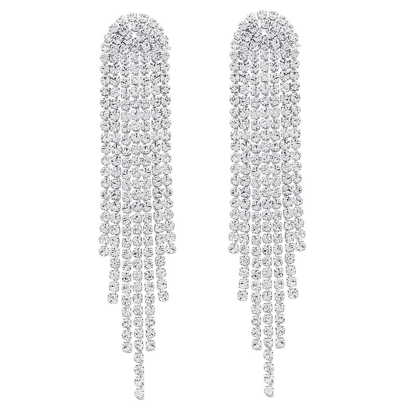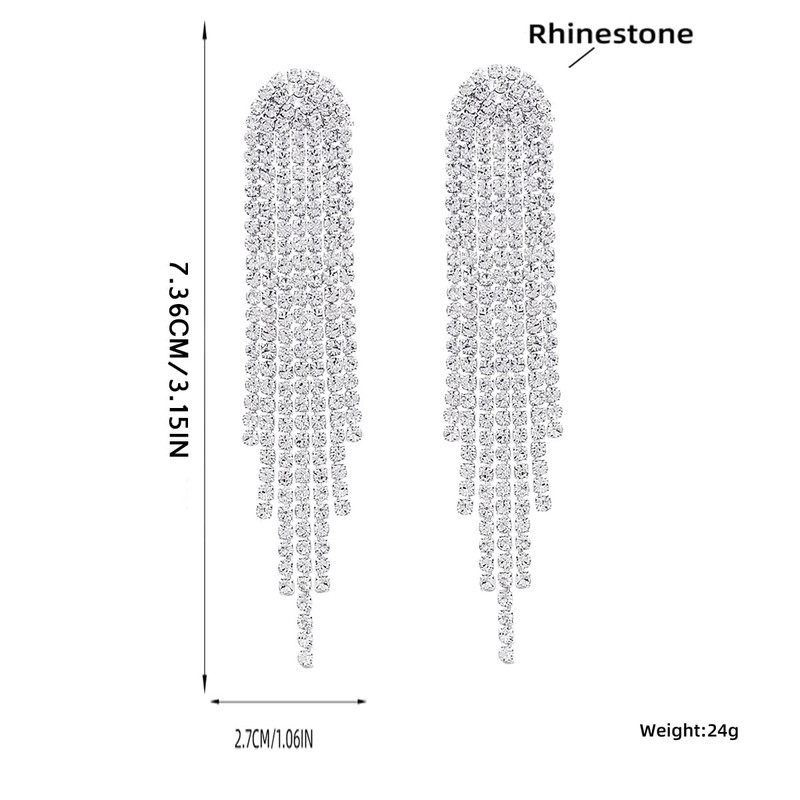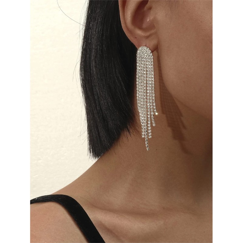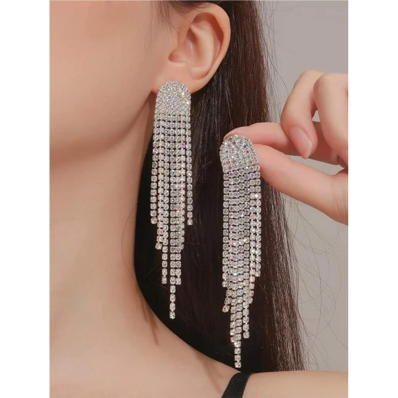 - Design:Sparkly Silver Rhinestone Crystal Drop Earrings Fringe Tassel Earrings are just the kind of look that we wanna wear out (and get noticed in)! Elegant strands of shiny gold snake chain and clear rhinestone chains cascade from post backs.