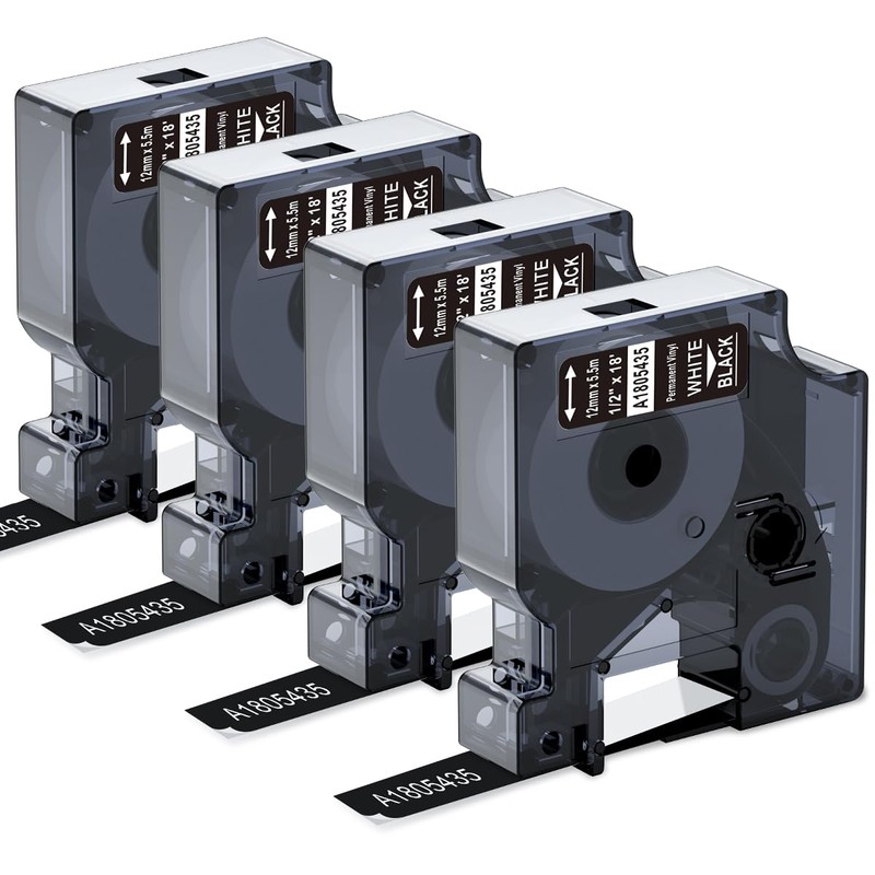 Rhino 4200 Label Tape Compatible with Dymo Rhino White on Black 1805435 Permanent Vinyl Labels Work with DYMO Rhino 5200 5000 5200 6000 3000 Industrial Label Maker Refills, 1/2" x 18', 4-Pack