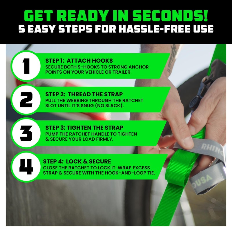 - RHINO EZ-RELEASE SYSTEM - Features a User-Friendly Design That Allows for Quick and Easy Strap Release, Enhanced by our Patented End Cap that Protects the Ratchet Mechanism, Saving Time During Loading and Unloading.