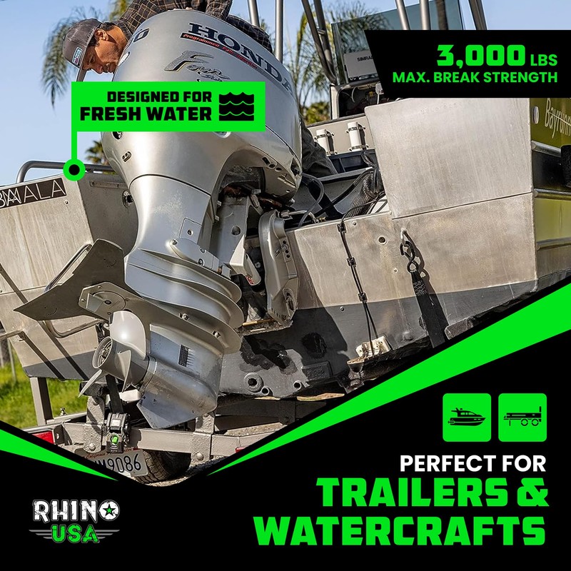 Rhino USA Retractable Boat Trailer Tie Down Straps 2PK – Durable (2in x 43in) Trailer Mount Transom Straps for Boat, Jet Ski – Powder Coated Black Steel – Fresh Water Compatible