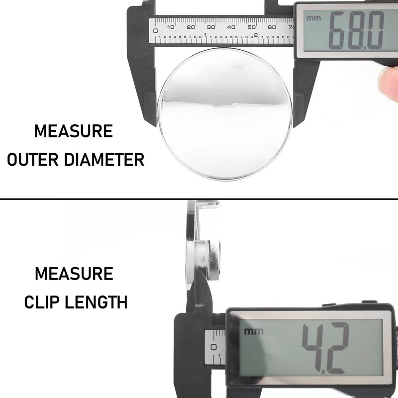 - Size: Maximum Diameter (OD): 2.68" / 68 mm, Backside Clip to Clip (ID): 2.42" / 61.5 mm, Clip length: 0.35" / 9 mm, Total Height: 0.48" / 12.14 mm, Sticker Diameter: 2.60" / 65 mm