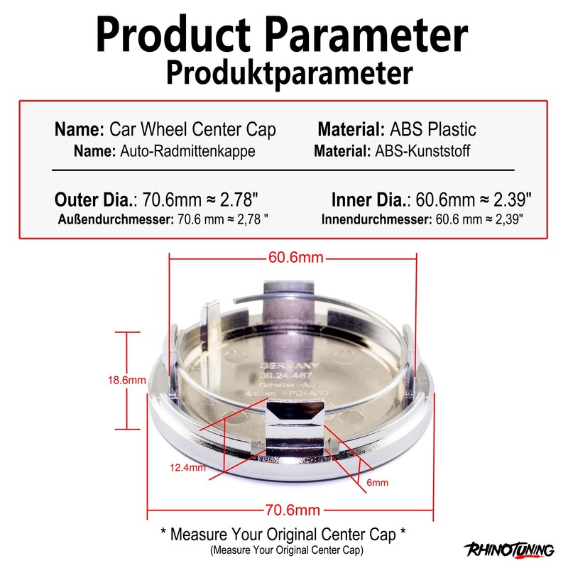 - 🚗Size:Wheel Centre Cap outer diameter 70.6mm, inner diameter 60.6mm, Hub cap height 18.6mm, clip length 6mm.(Important!! Please measure the size of your rims or old caps very well before ordering)