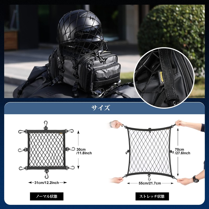 - High Elasticity & Durability: The net uses strong rubber for excellent elasticity. Two hook options: metal hooks are covered with rubber and will not scratch your motorcycle; reinforced plastic hooks can be adapted to diameter within 2cm and can be rotated. The net is made of high quality materials so it will not wear or lose its shape over a long period of time