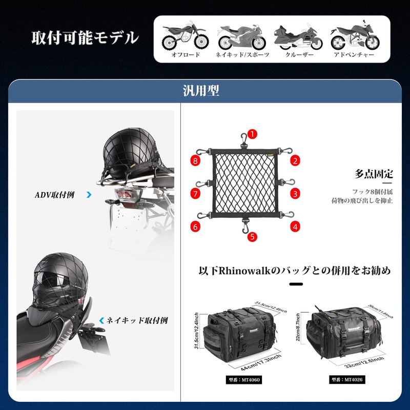 Rhinowalk Touring Net for Motorcycles, Cargo Net with 8 Hooks, Helmet Holder, Cargo Secure, Stretchable, Heavy Duty Elastic Cord, Prevents Loads from Falling, Bike Net