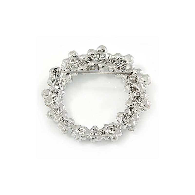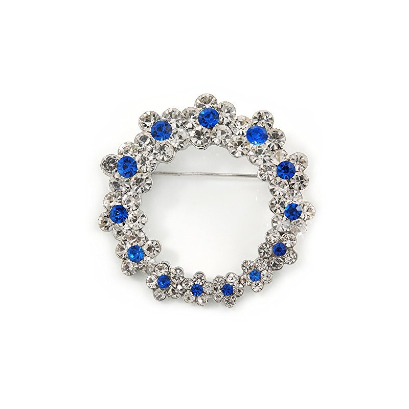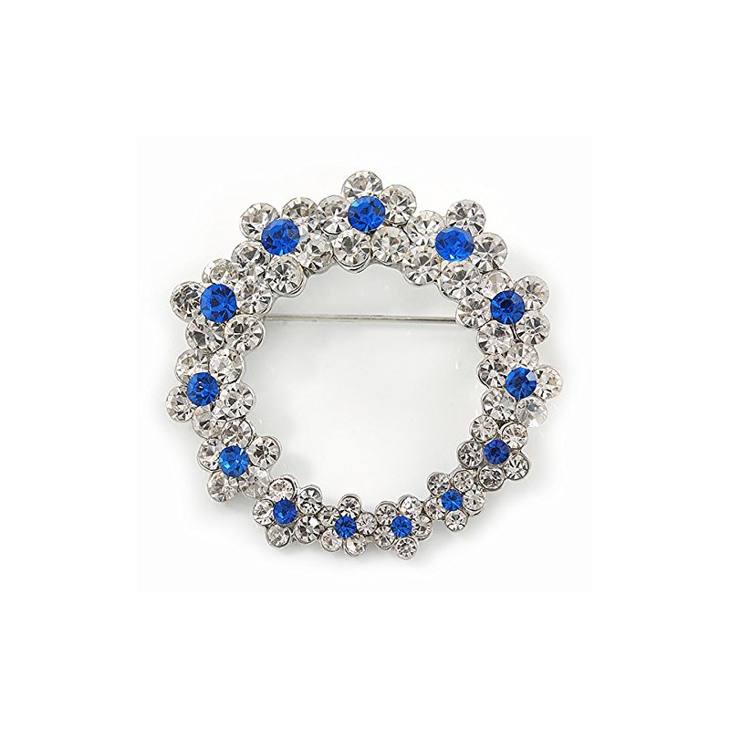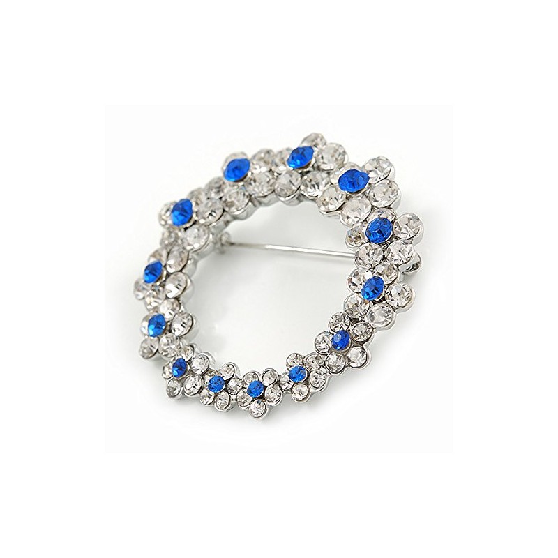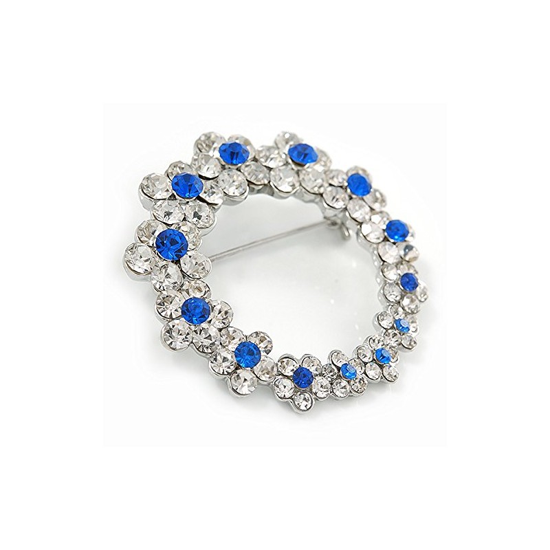 Rhodium Plated Clear/Sapphire Blue Crystal Wreath Brooch - 45mm