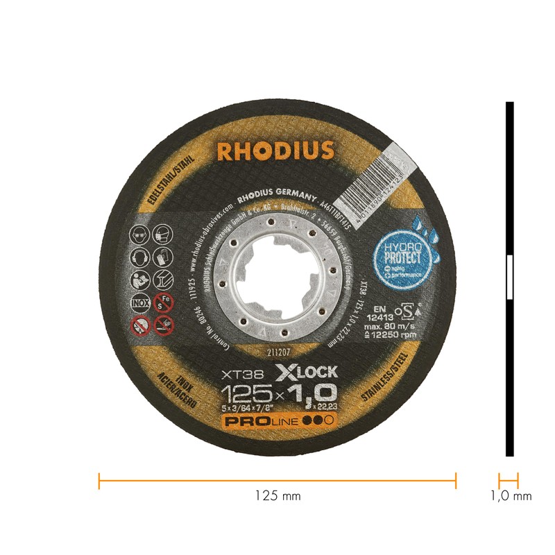 - Material: the Rhodius XT38 is the ideal cutting disc for cutting metal such as stainless steel / INOX / V2A, but also iron, steel and carbide.