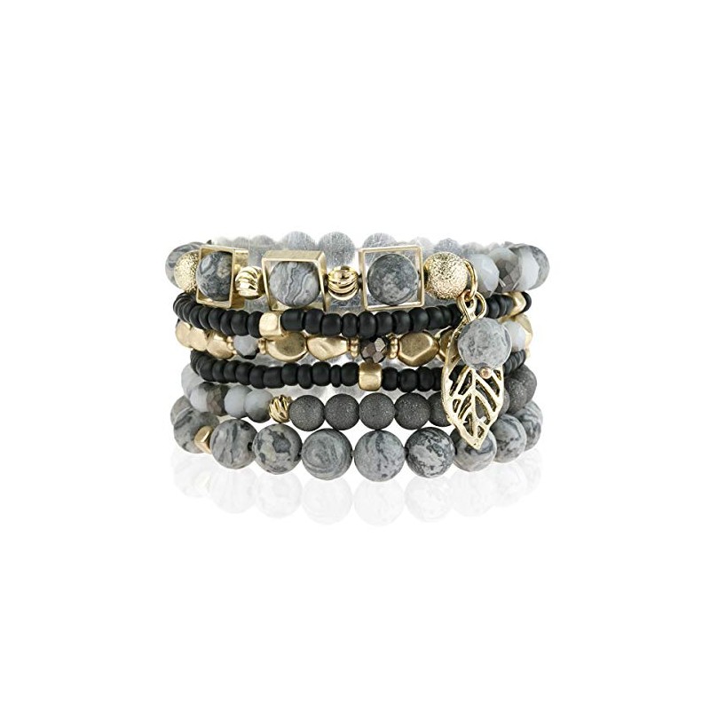 RIAH FASHION Bohemian Beaded Multi Layer Versatile Statement Bracelets - Natural Stone Leaf Charm Stackable Stretch Strand Bangles (Black)