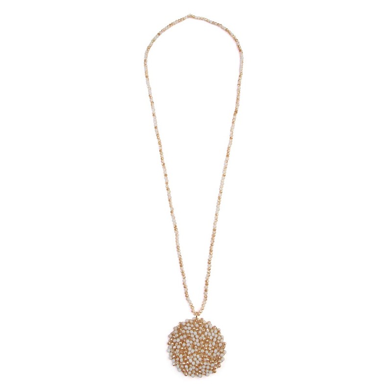 RIAH FASHION Bohemian Beaded Pendant Long Statement Necklace - Sparkly Crystal Bead Boho Braided Disc Wired Round Circle, Teardrop, Natural Stone, Tassel (Round - Brown/White)