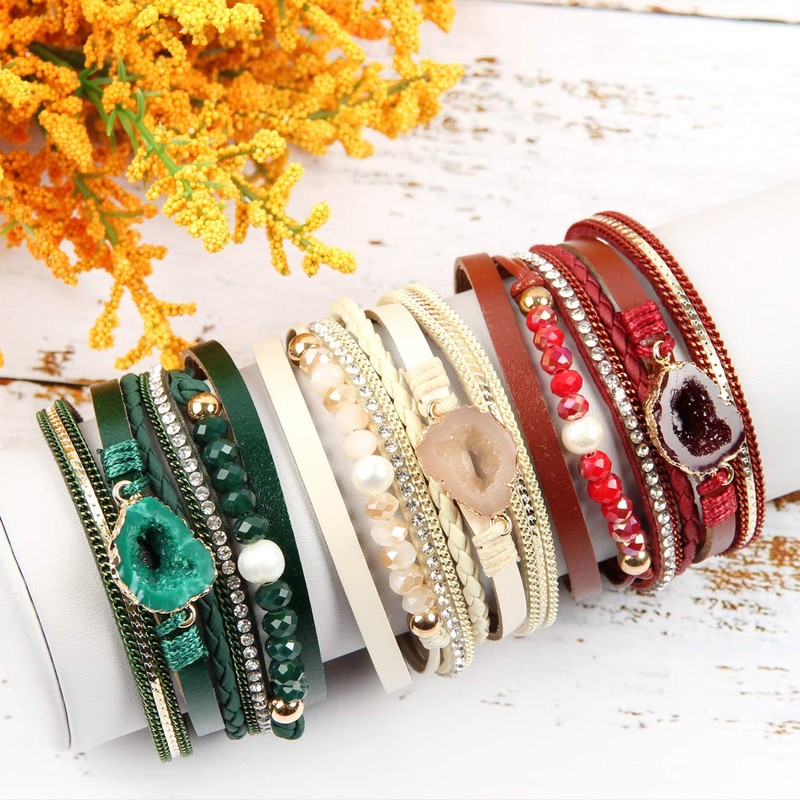 RIAH FASHION Pulsera bohemia de piel sintético de revestimiento múltiple, pulsera de diamantes de imitación cúbicos, abalorio brillantes, vidrio druso sintético, perla de piedra natural, 8 5 inch, Metal, no conocido