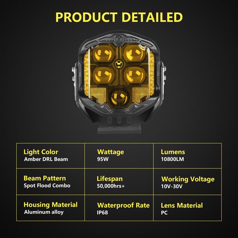 Riasdy 7 Inch Round Offroad Light 1 pcs Side Shooter 95W LED Amber DRL Spot Flood Combo Beam Driving Lights 10800LM Fog Light Waterproof Pod Light for Wrangler Pickup Truck 4x4 UTV ATV