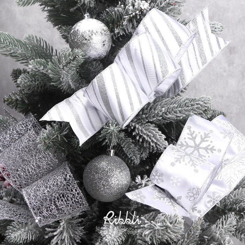 Ribbli Silver Wired Ribbon for Christmas Tree,Glitter Mesh Snowflake Stripe Christmas Ribbon for Crafts,Wreaths,Topper Bow,Gift Wrapping,Tree Decoration-4Rolls 2-1/2 Inch Total 40 Yard
