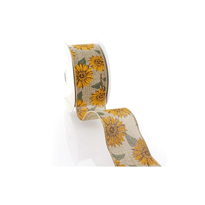 Natural burlap ribbon base with a summery cheerful sunflower print perfect for your rustic summer or fall wreaths, or gift packaging and décor needs.