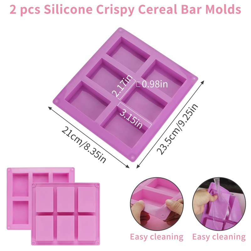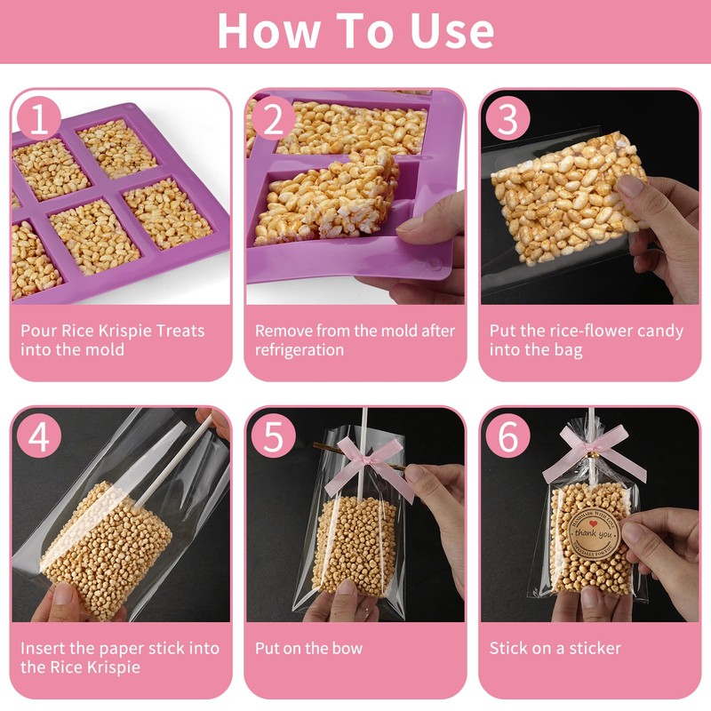 - Ideal Size: 3.5x6-inch clear bags fit Rice Krispies treats nicely; 8.3x9.2-inch silicone molds (6 cavities) create uniform bars for tidy wrapping. No-slip design ensures snacks stay secure and presentable