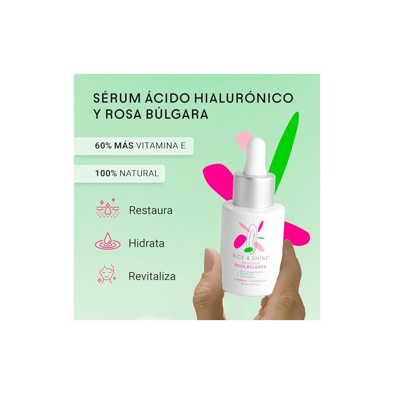 RICE SHINE Serum Facial Acido Hialuronico y Rosa Blgara Skin Care Con 60 ms Vitamina E que el Aceite de Argn - 100 Natural Hidratante Facial...