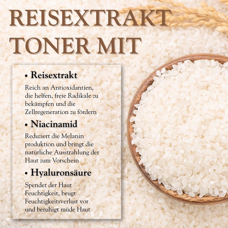 - Intensive hydration and skin barrier strengthening: this rice toner contains a high percentage of Korean rice extract and hyaluronic acid. It forms a moisturising barrier on the skin, provides it with intense moisture and prevents moisture loss. Natural rice ingredients nourish the skin, support the barrier function and give it softness and radiance