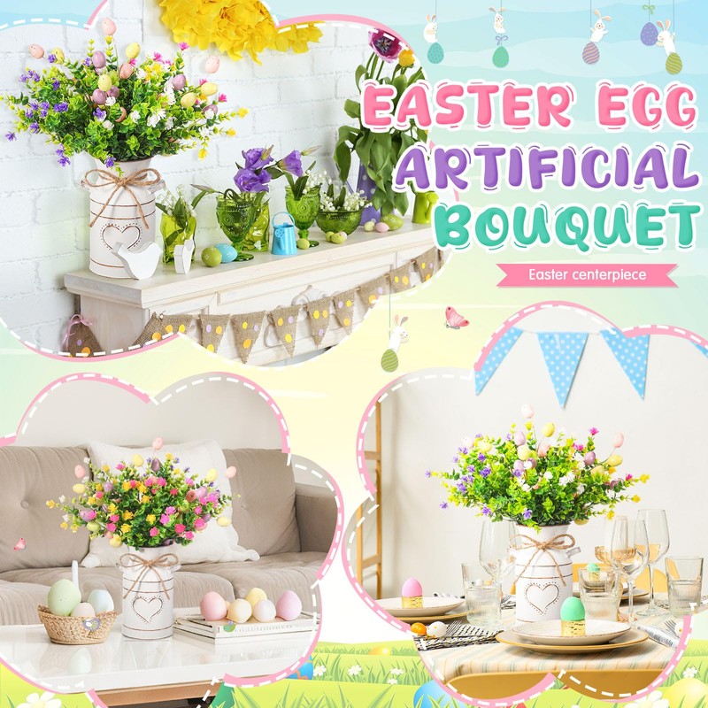 - Artificial Easter Egg Centerpiece Set: you will get 3 bunches of Easter egg stems, 5 bunches of artificial eucalyptus leaves, 1 galvanized vase with handles and twine bow, creating a strong festive atmosphere