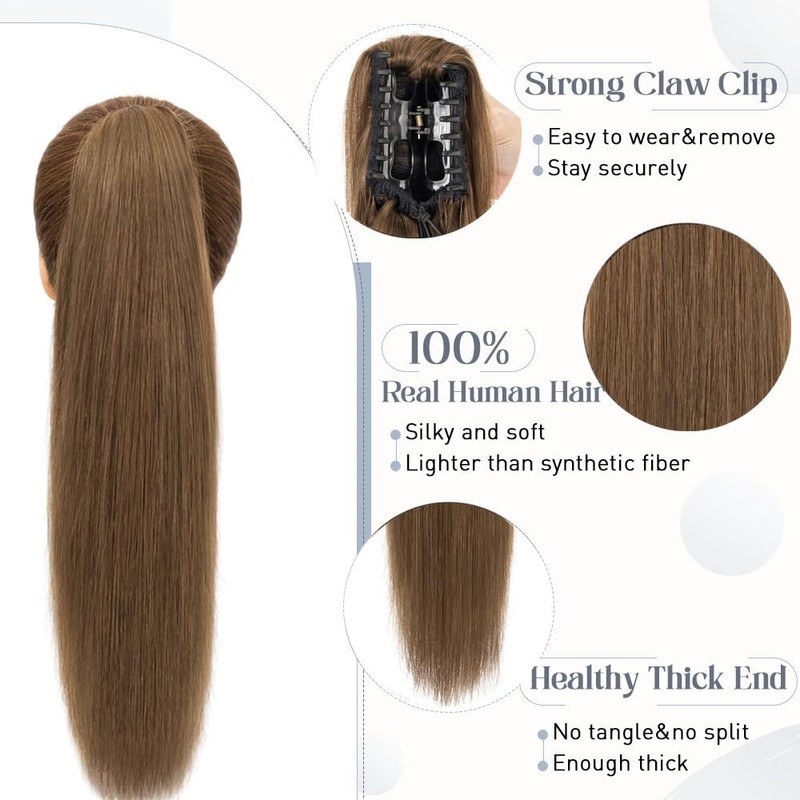 - ❤ The strong claw clip on human hair ponytail is very easy to wear and remove, and you don't have to worry about it falling off during daily activities. It blends perfectly with your hair, adding length, volume, and a style change effortlessly. Just take it easy when using it and you will have a new look!