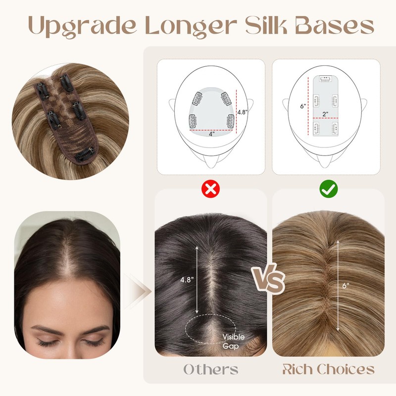 - ❤【 Easy to Use】: Equipped with 5 secure non-slip clips, this hair topper guarantees safety and comfort for all occasions. It seamlessly blends with your own hair within seconds, thanks to the silk base that mimics a real scalp. You can confidently wear the topper without anyone suspecting a thing.