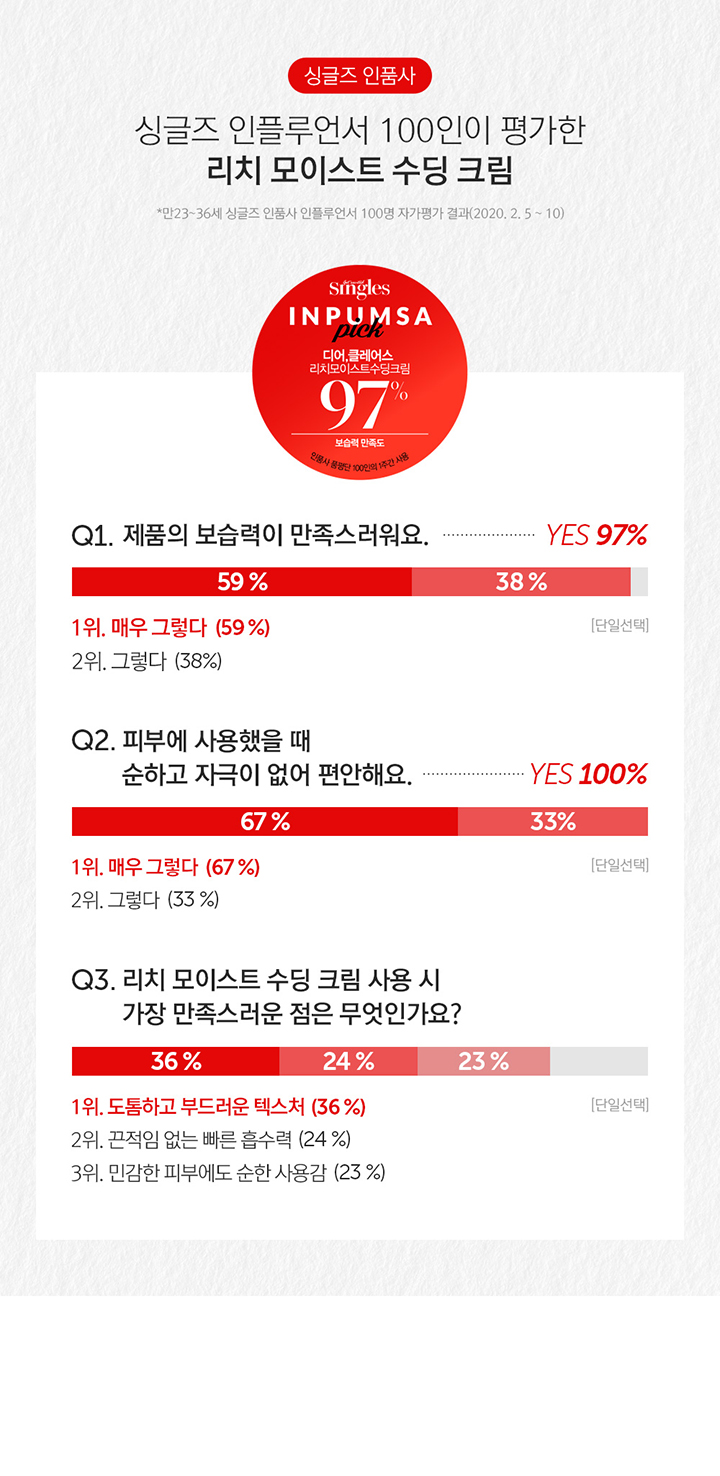 전성분 [리치 모이스트 수딩 크림80ml] 정제수, 글리세린, 카프릴릭/카프릭트라이글리세라이드,사이클로펜타실록세인, 세틸알코올, 글리세릴스테아레이트, 세틸에틸헥사노에이트, 시어버터, 호호바씨오일, 스테아릭애씨드, 부틸렌글라이콜, 솔비탄세스퀴올리에이트, 마이크로크리스탈린왁스, 베타인, 솔비탄스테아레이트, 피이지-100스테아레이트, 다이메티콘, 알지닌, 카보머, 클로페네신, 토코페릴아세테이트, 모란뿌리추출물,스타아니스추출물, 연꽃꽃추출물, 자몽추출물, 황금추출물,시트릭애씨드, 베타-글루칸, 하이드로제네이티드레시틴, 쇠비름추출물, 1,2-헥산다이올, 병풀추출물, 알로에베라잎추출물, 접시꽃추출물, 소듐하이알루로네이트, 세라마이드엔피, 다이소듐이디티에이, 폴리쿼터늄-51, 셀러리추출물, 순무잎추출물, 쌀겨추출물, 양배추추출물, 다이소듐아데노신트라이포스페이트, 당근추출물, 브로콜리추출물, 토마토열매/잎/줄기추출물, 라이신에이치씨엘, 소듐아스코빌포스페이트, 아세틸메티오닌, 테아닌, 프롤린, 팔미틱애씨드, 아라키딕애씨드, 올레익애씨드, 소듐하이드록사이드, 알진, 파파야열매추출물, 낫토검, 레몬껍질오일, 라벤더오일, 오렌지껍질오일, 센티드제라늄꽃오일, 일랑일랑꽃오일, 유칼립투스잎오일