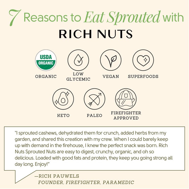 - Healthy Snack: Our thoughfully seasoned sprouted nuts are easier to digest, nutrient dense, bio-available, full of good fats and protein while being crunchy and delicious. All of our products are USDA Certified Organic, preservative-free, pesticide-free, vegan, gluten-free, Keto and Paleo diet approved.
