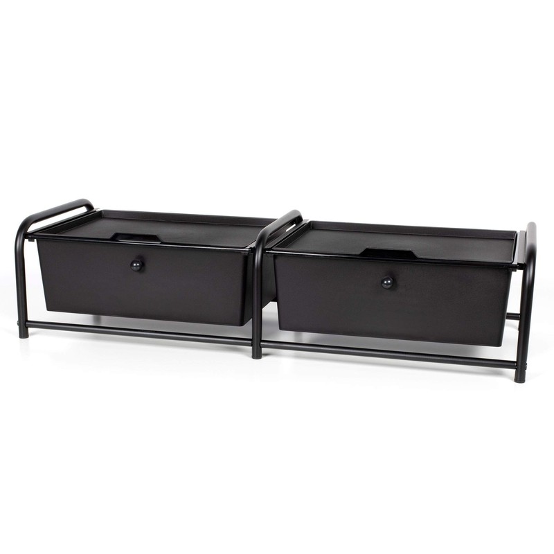 - The durable black metal frame has two black matte molded plastic drawers. Each drawer has a knob on the front and a removable lid