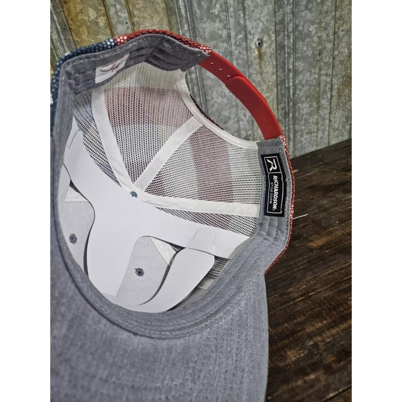 Show off your patriotism with this Richardson brand American Flag Hat. The adjustable trucker hat is perfect for men who want to make a statement. The gray color hat features a leather patch and the iconic "BULLETPROOF" slogan.