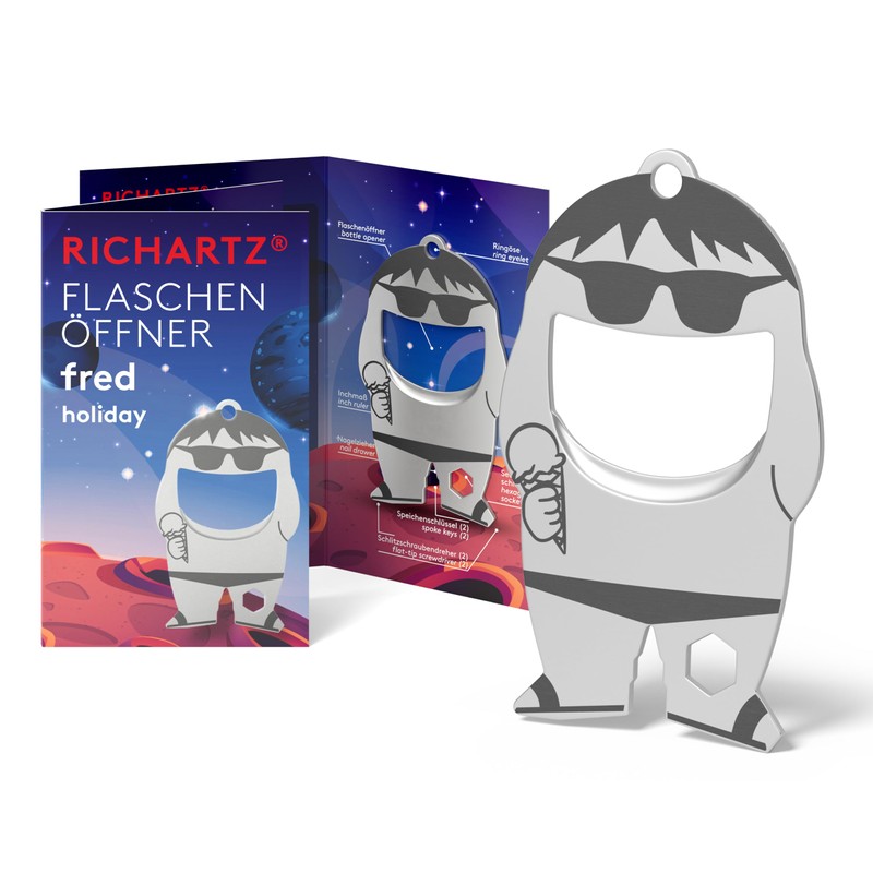 RICHARTZ Bottle Opener Fred Holiday | Multitool Keyring | 10 Practical Functions | Matt Blasted Stainless Steel | Key Ring Tool with Function Description