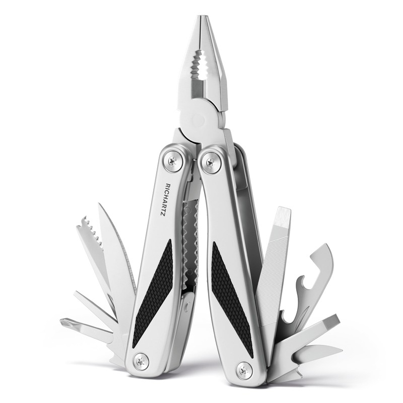 RICHARTZ Grip Tool | Multitool with 10 Functions Including Pliers & All-Purpose Blade | Stainless Steel Handles with Black Plastic Inserts | Securely Lockable Multitool Tool Including Belt Bag