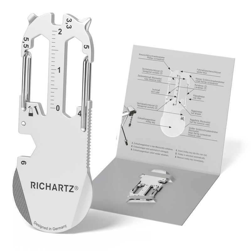 - 16 FUNKTIONEN: Kreuzschlitzschraubendreher, Schlitzschraubendreher, Sechskantschlüssel (4x), Zentimetermaß (Rückseite), Inchmaß, Karabiner (2x), Kapselheber, Nagelzieher, Fahrradspeichenschlüssel, großer Schlitzschraubendreher, Nagelfeile (Rückseite), Einkaufswagenlöser