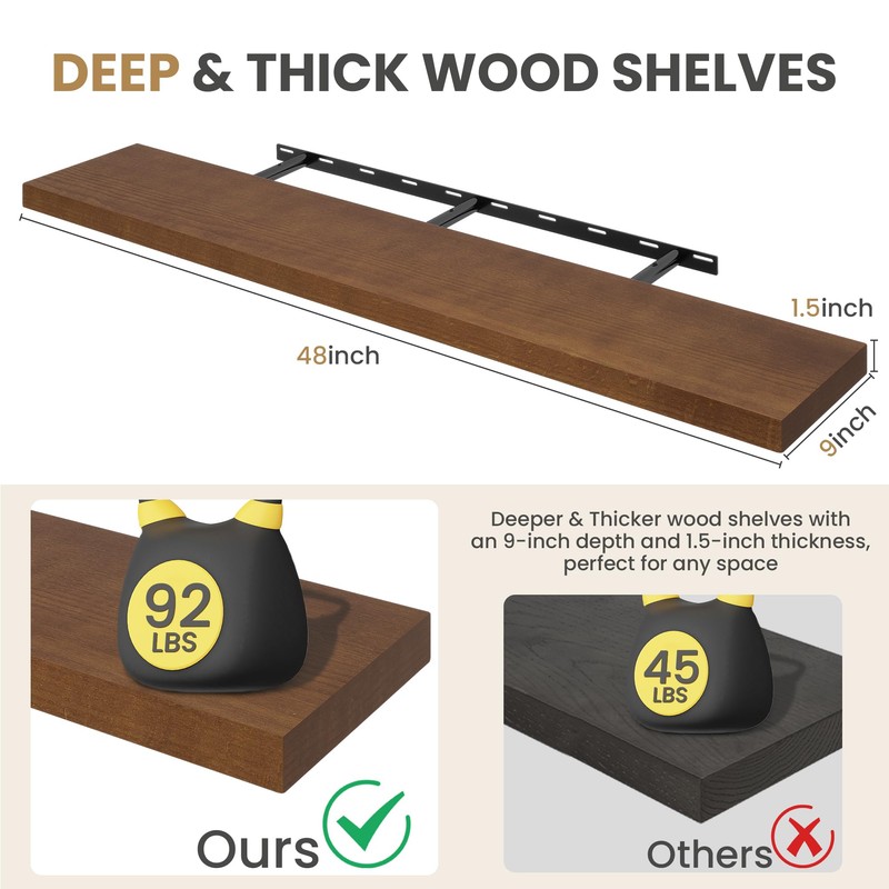 - Deeper & Thicker Floating Shelf: Measuring 48" Wide x 9" Deep x 1.6" Thick, these storage shelves provide larger and deeper storage capacity than traditional floating shelves for wall. Perfect for storing books, baskets, towels, spice bottles, cups, and other everyday household items. Various sizes are available to meet different home spaces, and you can also choose different sizes for free combination