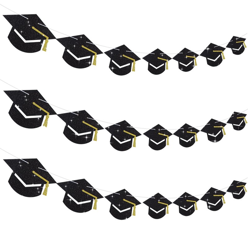RICHHHA 3 String Glitter Black Graduation Cap Garland, Pre-strung, 2025 Graduation Celebration Party Decoration Banner,Class of 2025 Decor,Congrats Grad Graduation Photo Background